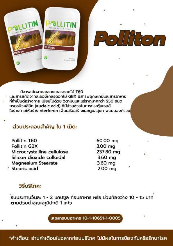 พอลลิตัน Polliton ประกอบด้วย -มีสารสกัดจากละอองเกสรเกสรดอกไม้ G60 และ GBX -มีสารอาหารและกรดอะมิโนที่จำเป็นต่อร่างกาย เปี่ยมไปด้วยวิตามิน และแร่ธาตุ มากกว่า 300 ชนิด -กรดนิวคลีอิก (Nucleic acid) ที่มีส่วนช่วยในการกระตุ้นเซลล์ในร่างกายให้สร้าง -อินเตอร์เฟียรอน (Interferon) เพื่อเสริมสร้างและดูแลแบบองค์รวม -ลดอาการปวดและอักเสบในร่างกาย ลดการอักเสบของต่อมลูกหมากโต เลขสารบบอาหาร 10-1-10651-1-0005 Polliton Polliton™contains 63.00 mg.Flower Pollen Extract. Polliton™supplies vital nutrients to the body and cells as well as improving immune function and various health applications. Benefits: